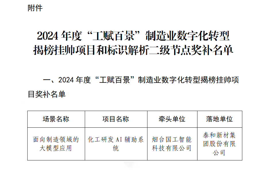 6月3日,省工信廳發(fā)布《關(guān)于2024年度“工賦百景”制造業(yè)數(shù)字化轉(zhuǎn)型揭榜掛帥項(xiàng)目和標(biāo)識(shí)解析二級(jí)節(jié)點(diǎn)獎(jiǎng)補(bǔ)公示名單》,作為全省33個(gè)通過驗(yàn)收的項(xiàng)目之一,由國工智能與泰和新材揭榜掛帥的面向制造領(lǐng)域的大模型應(yīng)用——“化工研發(fā)AI輔助系統(tǒng)”項(xiàng)目榜上有名。
