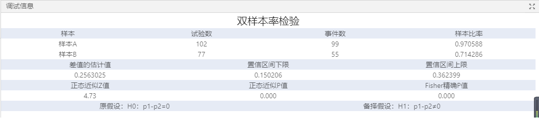 使用雙樣本率檢驗組件可執行確定兩個組的總體比率是否不同和計算可能包括總體比率之間差值的值范圍。