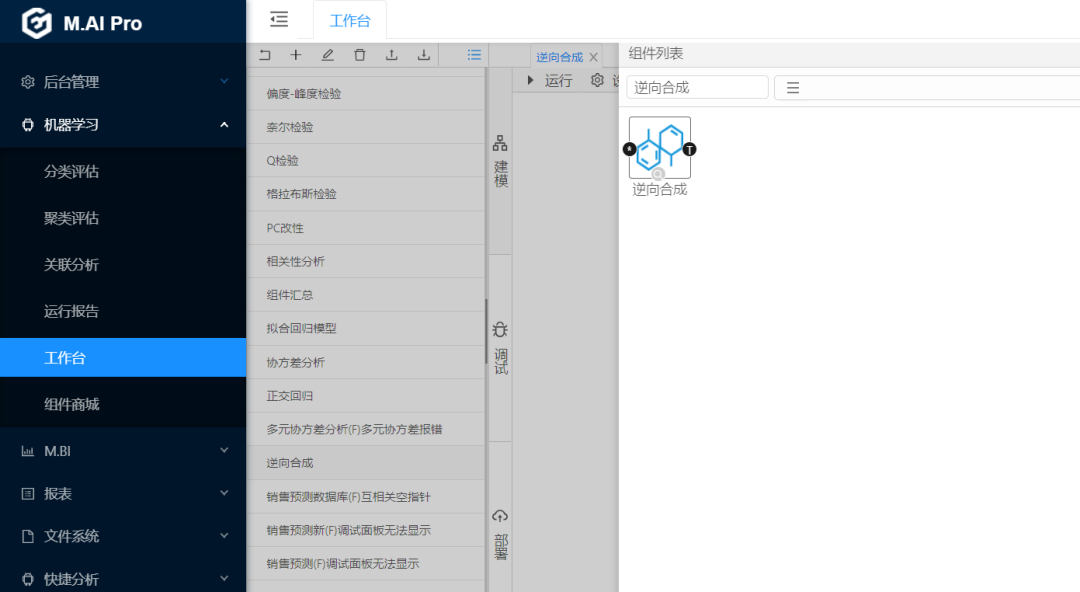 首先打開國工數(shù)據(jù)大腦平臺。依次進(jìn)行操作:機(jī)器學(xué)習(xí)-->工作臺—>新建逆向合成計算流程—>拉取逆向合成組件(圖1)