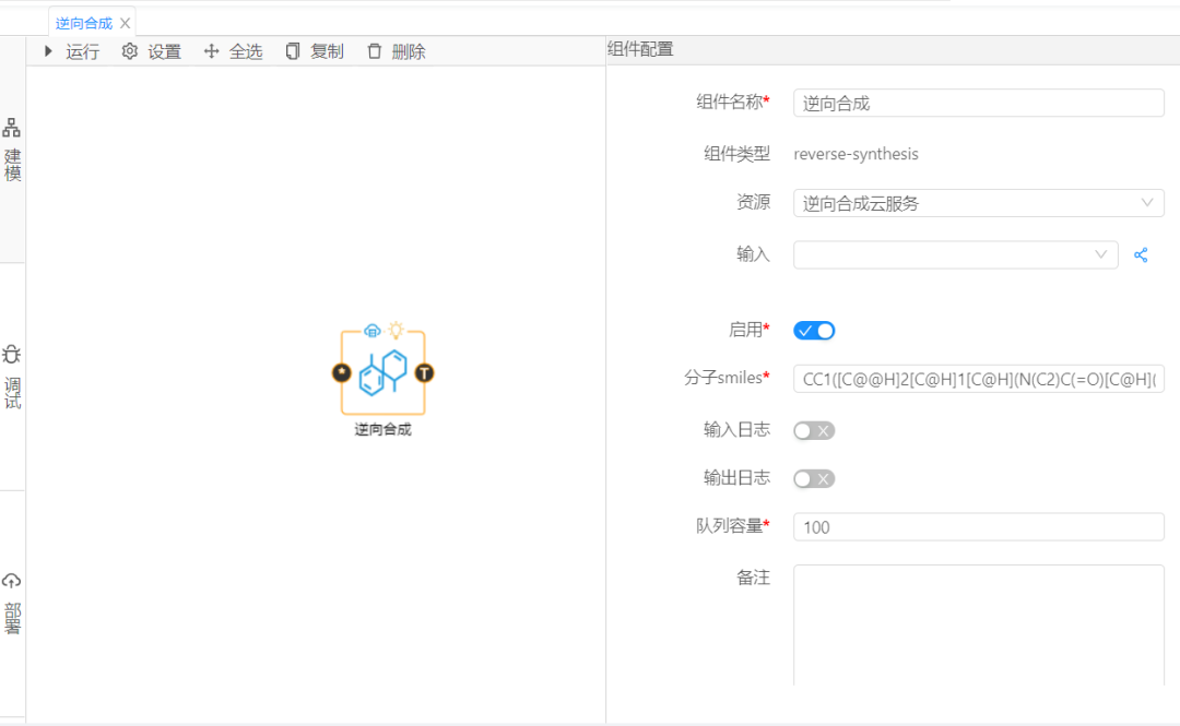 然后,進(jìn)行組件配置。資源項選擇逆向合成云服務(wù),分子式填入?yún)⑴c反應(yīng)的相關(guān)反應(yīng)的SMILES表達(dá)式,并按照相應(yīng)規(guī)則填入,如圖2所示。最后點擊調(diào)試,當(dāng)顯示運行成功時即表示運行預(yù)測算法成功,平臺會將預(yù)測結(jié)果展現(xiàn)給用戶,結(jié)果如圖3所示。