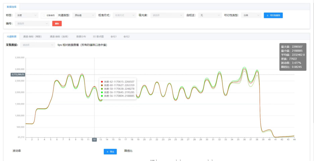 將每組采集到的21條數據進行查看,光譜圖顯示同組內數據的波動率都在2%以內,數據較為穩(wěn)定。如下圖