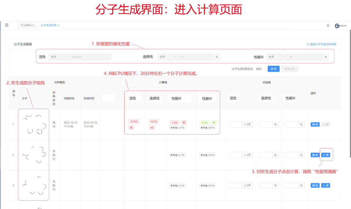 在有了清晰的“構效關系”后,將其嵌入到分子生成算法中,算法便可以根據提示朝著所希望的性能去生成分子。結合前面的性能預測器一起使用,便形成一整套AI輔助下的催化劑設計工具。