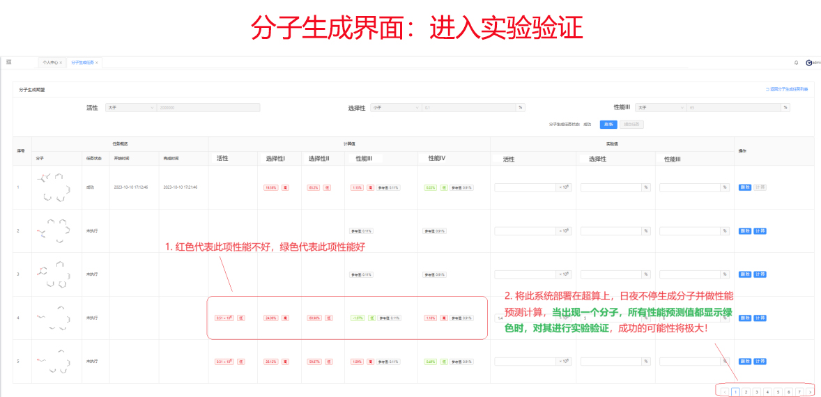 分子生成:直到生成預測值全部滿足要求的分子,然后選擇其進入實驗驗證。
