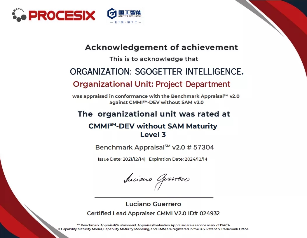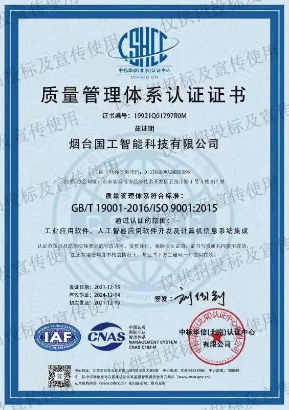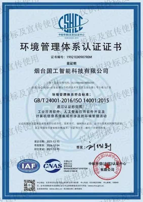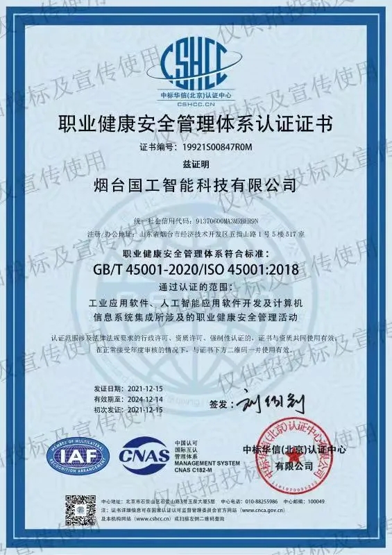 2021年12月中旬,煙臺國工智能科技有限公司正式獲得ISO 14001環(huán)境管理體系認證證書、ISO 9001質量管理體系認證證書以及ISO 45001職業(yè)健康安全管理體系認證證書。同期獲得了軟件能力成熟度模型集成(CMMI:Capability Maturity Model Integration)三級認證證書。標志著國工智能在智能制造行業(yè)的規(guī)范化和標準化管理達到新的水平。