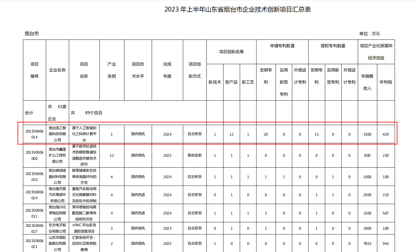 5月29日,山東省工信廳發布《山東省工業和信息化廳關于印發2023年山東省第一批技術創新項目計劃的通知》,國工智能“基于人工智能的化工科研計算平臺”入選此次創新項目計劃。
